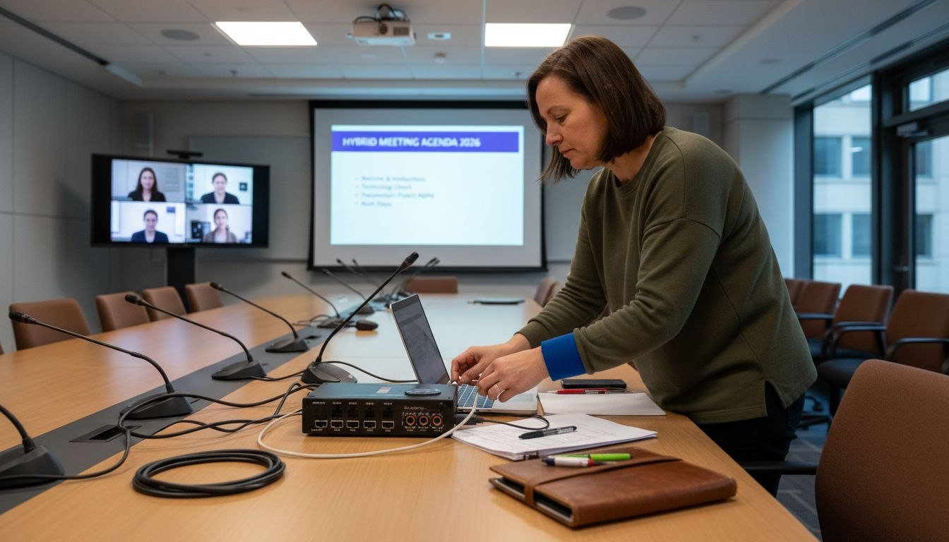 Hybrid systems use multiple cameras, bi-directional audio with echo cancellation, and confidence monitors showing remote attendees at life-size scale. This technology creates engagement parity between in-room and virtual participants.